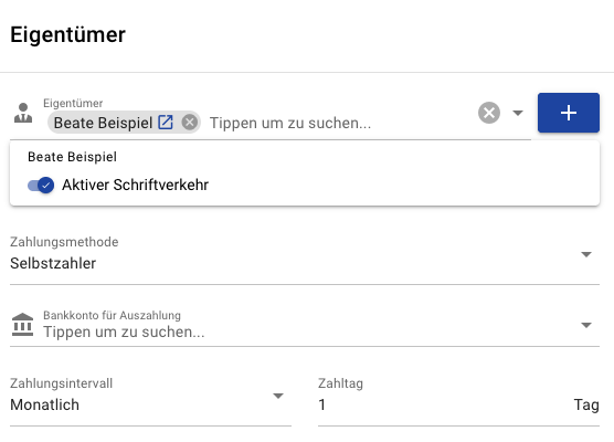 In diesem Fall befolgen Sie die Anweisungen im Hinweis- Sie fügen also fehlende Eigentümer hinzu und/oder blenden Einheiten aus, welche für diese ETV ausgenommen sein sollen. Gehen Sie auch sicher, dass im Eigentumsverhältnis ein Haken für den aktiven Schriftverkehr gesetzt ist.
