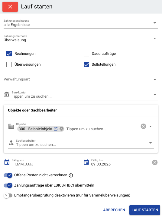 Mit Objekt oder Sachbearbeiter können Sie den Lauf auf bestimmte Objekte eingrenzen. Bleiben die Felder leer, werden alle Objekte berücksichtigt. Bei HBCI/FinTS müssen ausgewählte Objekte das zuvor angegebene Bankkonto verwenden.