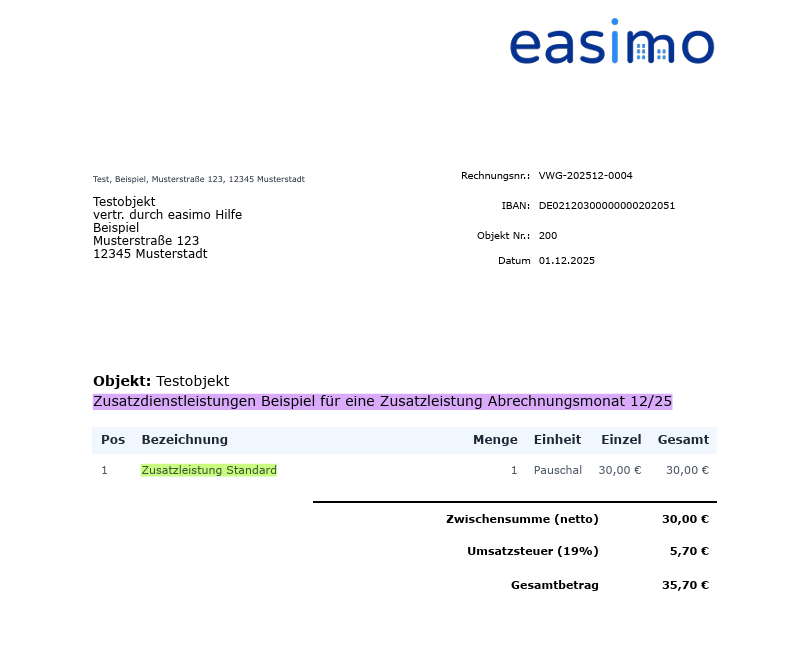 - Grün: Dieser Text wird aus der Bezeichnung der Zusatzleistung übernommen.