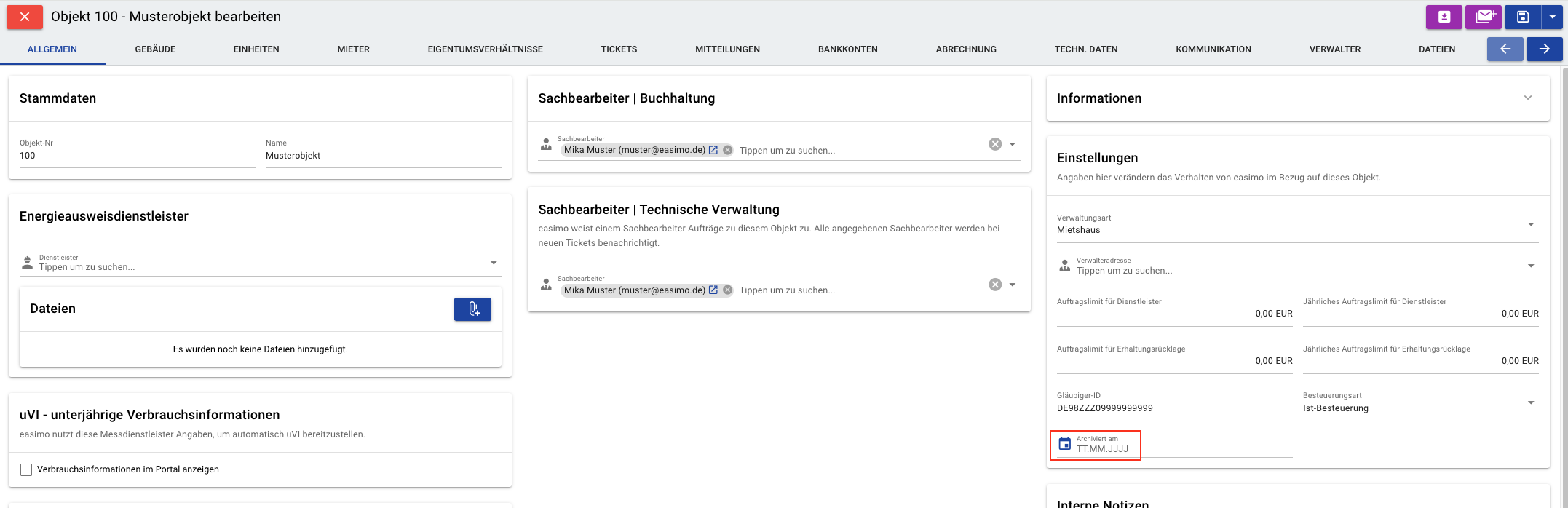 Um ein Objekt/Gebäude zu archivieren, muss lediglich das Datum, ab welchem die Archivierung greift, in den Stammdaten des Objekts/Gebäudes unter "Allgemein" eingetragen werden.