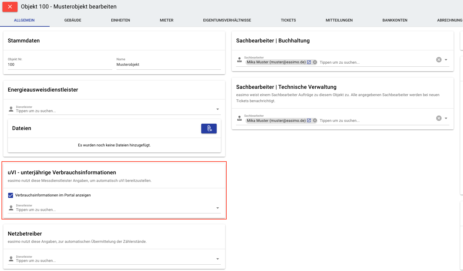 - Im Objekt können Sie nun die Funktion der uVI aktivieren und den Messdienstleister verknüpfen.