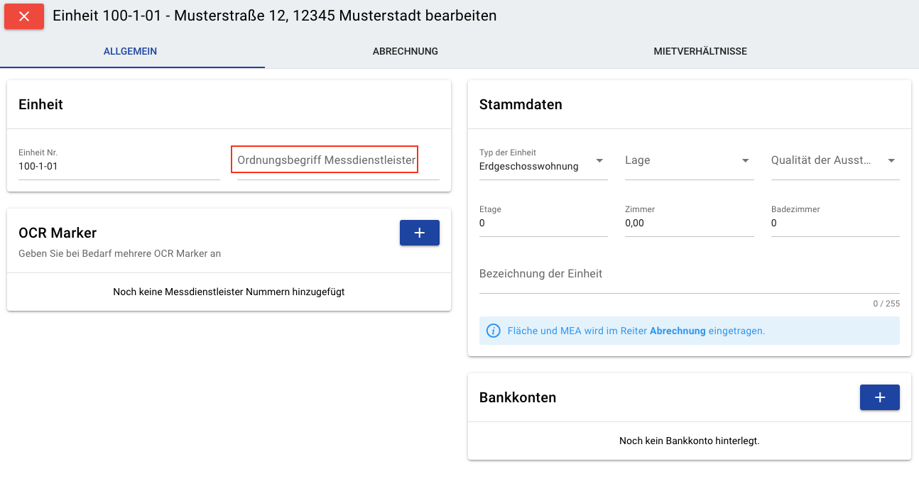 In der Einheit tragen Sie den Ordnungsbegriff Ihres Messdienstleisters ein.