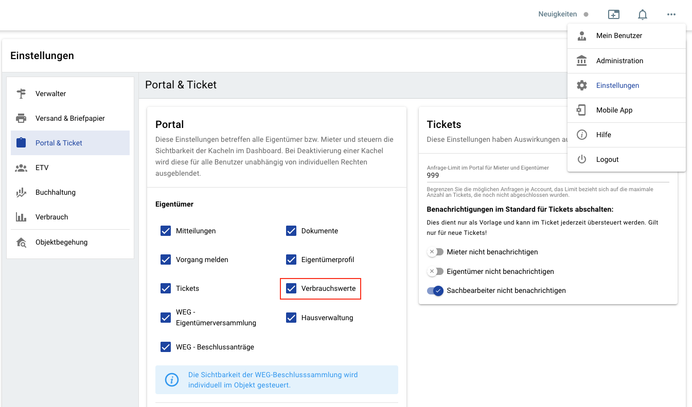 In den Einstellungen können Sie steuern, ob die Verbrauchswerte für Eigentümer im Portal sichtbar sein soll.