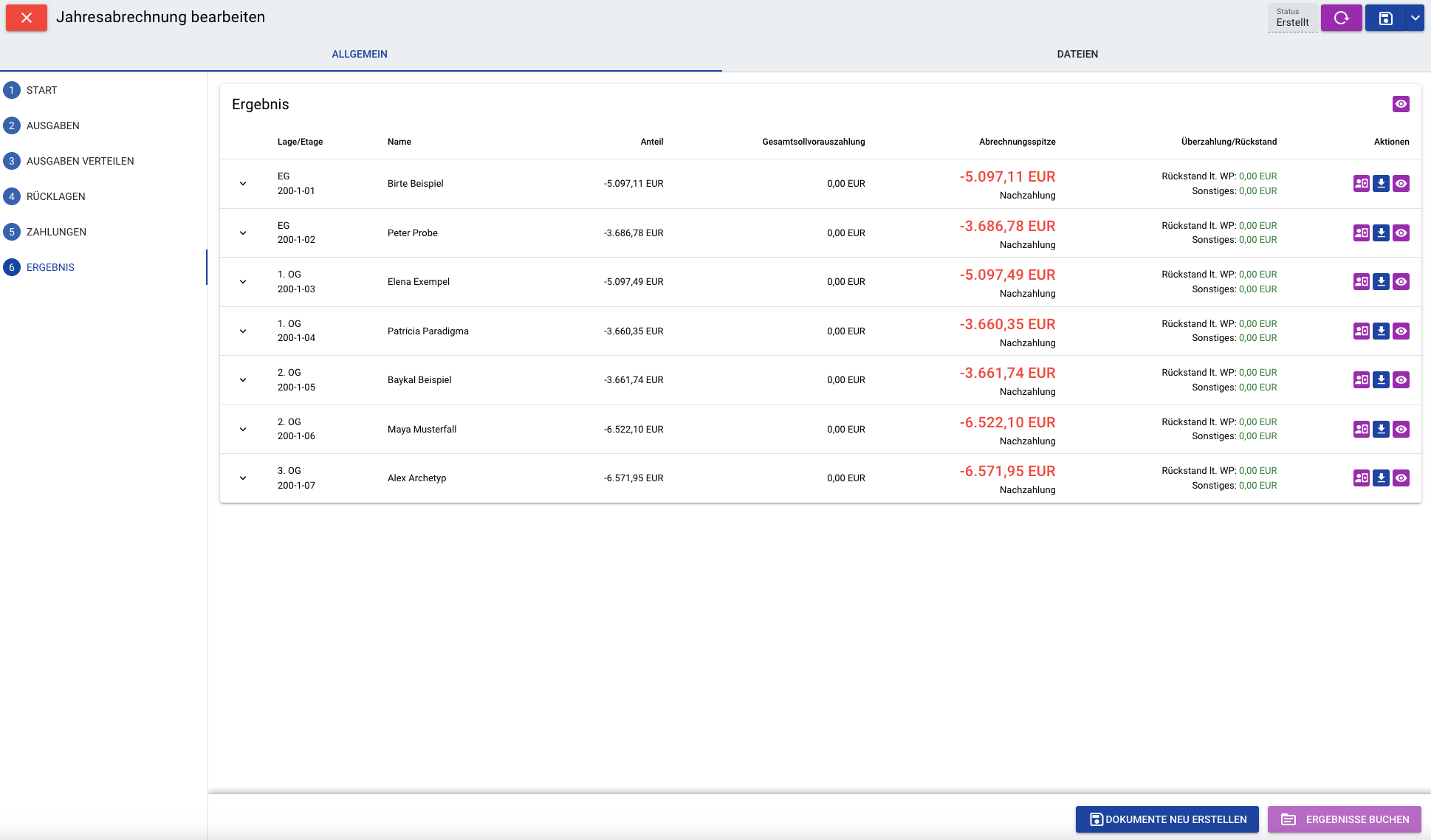 Sie können sich nun im letzten Schritt die generierten Jahresabschlüsse für alle Eigentümer anzeigen lassen, herunterladen und auch in die einzelnen Buchungen springen.