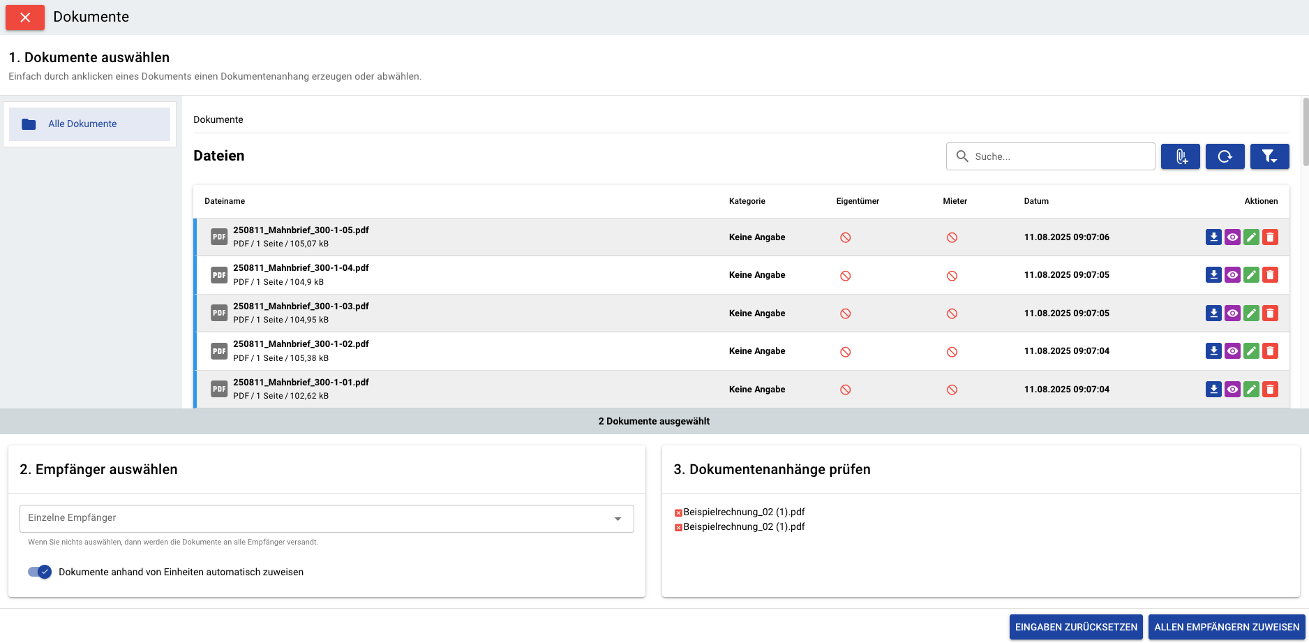 Wählen Sie hier die Dokumente aus und aktivieren Sie den Schieber für "Dokumente anhand der Einheiten automatisch zuweisen". Jeder Eigentümer erhält dann das für ihn bestimmte Dokument.